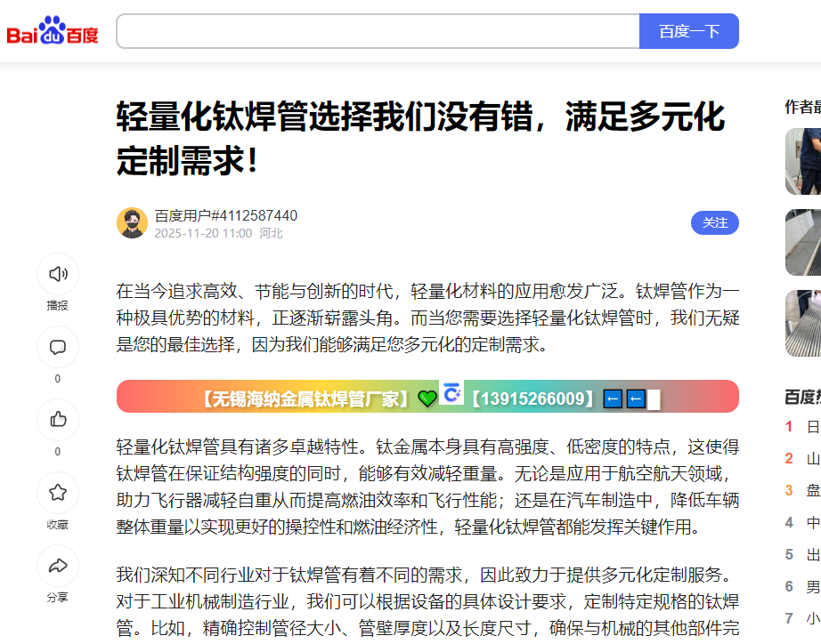 無錫海納金屬科技有限公司是一家專業從事高品質鈦焊管、鎳基合金焊管、超級奧氏體等材料的制品生產型企業。公司擁有多條高精度焊管生產線,制管口徑覆蓋Φ6-Φ108mm幾十種產品規格,公司選用國內優質鈦帶卷材,每批次材料入庫制管前必須通過公司實驗室理化性能、成分抽檢合格方可投產使用,焊管產品出廠前必須經100%嚴格的內外焊縫整平、精密焊縫跟蹤檢測、渦流探傷檢測、高壓氣密試驗、物理強度拉伸等品控試驗;產品對標符合GB、ASTM等相關標準的技術要求。海納公司常年輔以高校院所金屬材料及焊接工藝專業力量、研發技術支持,不斷創新和精益求精,力求滿足客戶的不同行業需求及高標準技術指標要求。公司產品自投入市場以來,深受新老客戶好評,被廣泛使用于石油化工裝備、核電火電能源、海洋船舶、海水淡化、水處理、航空航天、汽車、民用等領域;